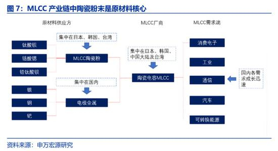 MLCC产业链主要分为上游原材料、中游制造原厂、下游应用。原材料主要涵盖陶瓷粉末、电极金属等,其中陶瓷粉末是最关键的原料,决定了MLCC的性能。其核心要求在于纯度、颗粒大小和形状等。高纯、超细、高性能陶瓷粉体制造技术和工艺是制约我国MLCC产业发展的瓶颈,因其制备难度大,绝大部分市场份额被日韩供应商占有,银、镍等电极金属则主要由国内厂商供应。中游的制造环节主要集中在日韩、中国台湾和大陆。