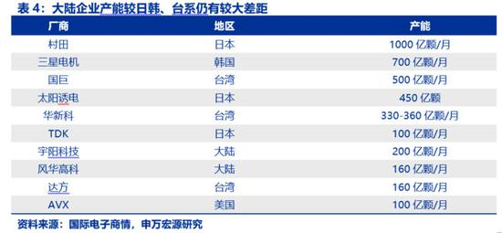 产能规模上,大陆企业较日韩、台系厂商仍有较大差距,导致行业话语权较低。对于大宗品属性的产品来说,产能规模是衡量产业地位的重要因素,决定了对行业供给的影响力。村田、三星电机占据着绝对优势,村田更是以约1000亿颗/月的MLCC产能引领全球市场。排在第二阶梯的主要是台系的国巨、华新科以及日系的太阳诱电。大陆的风华高科、宇阳科技产能规模仍较小。此外,各大厂商都有常规MLCC产能,但高端MLCC产能因为对技术要求比较高,目前集中在日本厂商手中。