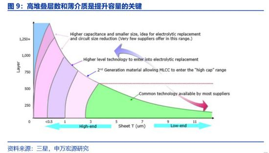 薄介质,高层数是工艺的发展方向。提升电容量是MLCC一直以来的趋势。MLCC的电容量与内电极交叠面积、电介质瓷料层数及使用的电介质陶瓷材料的相对介电常数成正比关系,与单层介质厚度成反比关系。因此,在一定体积上提升电容量的方法主要有两种,其一是降低介质厚度,介质厚度越低,MLCC的电容量越高;其二是增加MLCC内部的叠层数,叠层数越多,MLCC的电容量越高。