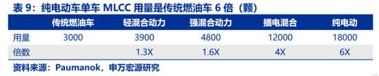 新能源车的整车MLCC用量是传统燃油车的6倍。不同车型的电子化率不同,根据中国产业信息网的数据,纯电动车的电子成本占比约65%,混合动力车为47%,中高端燃油车28%,低档车15%。根据Paumanok数据,综合考虑电子化率和动力系统,测算纯电动车的单车MLCC用量约18000颗,传统燃油车单车仅3000颗。