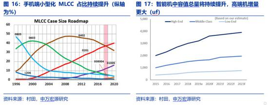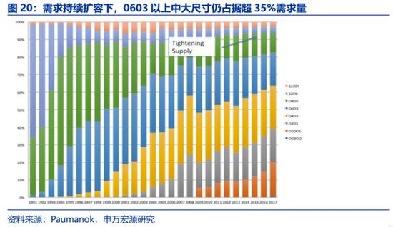 日韩龙头调整产能结构,供给格局重塑。日韩厂商自2016年起逐渐将产能向高端市场转移,逐步退出中低端市场。产能调整导致中大尺寸常规品供给出现缺口,部分型号未来供给紧张。大陆企业将持续承接退出产能,成为常规品的主力。且凭借在小型化0201产品的规模化供应能力,将享受到智能手机升级带来的MLCC需求红利。
