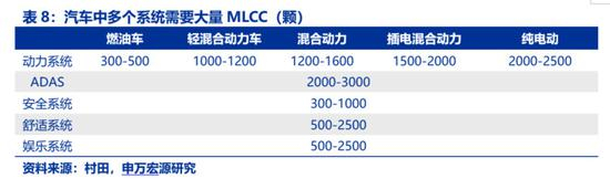 汽车电子化率和新能源车渗透率的提升是车用MLCC用量爆发的两大核心驱动力。汽车中的多个系统都需要用到MLCC,主要包括ADAS、安全系统、娱乐系统、舒适系统以及动力系统。其中,纯电动车在动力系统上的需求量达2000-2500颗,而传统燃油车仅需300-500颗,差距巨大。此外,汽车电子化率的提升也意味着娱乐系统、ADAS系统的搭载率提升,对于MLCC用量亦有明显的提升作用。