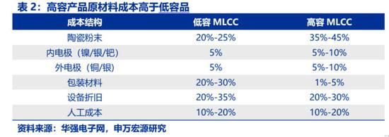高容值产品原材料成本更高,占比约45%-65%。MLCC成本构成包括原材料成本、包装材料、设备折旧、人工成本等部分。原材料成本又由陶瓷粉末、内电极、外电极等构成。高容产品的原材料成本占比大幅高于低容常规品,主要是在核心陶瓷粉末的要求上更高。