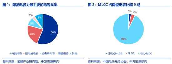 多层陶瓷电容器(MLCC)为陶瓷电容最主要形式,占陶瓷电容比超9成。陶瓷电容器可以分为单层陶瓷电容器(SLCC)、多层陶瓷电容器(MLCC)和引线式多层陶瓷电容。MLCC具有耐高压、耐高温、体积小、电容量范围宽、适合于表面贴装等特点,在成本和性能上都占据优势,下游应用较为广泛,其市场规模占整个陶瓷电容器的93%,成为主要的陶瓷电容。因此从细分品类来看,MLCC实际为需求量最大的被动元件。