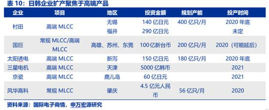 日韩企业扩产聚焦于高端产品,大陆以及台系企业以扩产常规品为主。村田在无锡规划了400亿只/月的高端MLCC产能,主要应用于汽车、医疗、工业等领域,预计在2020年底释放相应产能。太阳诱电、三星、京瓷也均将扩产集中于高容值、小型化的高端产品。而台系的国巨和大陆的风华高科、以及三环集团等则是常规MLCC产能扩充的主力。