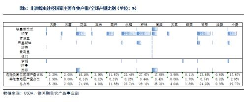 从国家角度而言,印度为典型的农业大国,水稻棉花以及甘蔗等作物的产量均占全球相当可观的比例,巴基斯坦部分农作物如棉花和甘蔗也占全球一定比例,而东非及西亚国家各个农产物产量较小,占全球比例甚低。