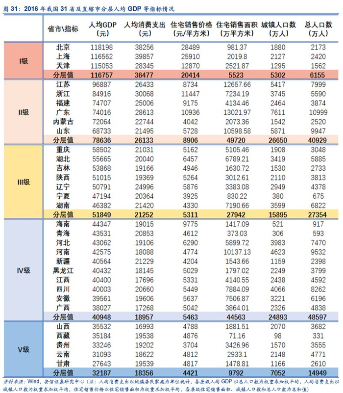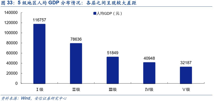 从人口来看,经济越发达的地区城镇人口占总人口的比例越高,Ⅰ级和Ⅱ级地区分别拥有约 0.5 亿和 2.7 亿的城镇人口,构成了中国高收入/高消费人群的主体结构,Ⅲ级 地区(中收入层)拥有约 1.6 亿城镇人口,同样超过了世界上绝大多数国家的人口总数,成为这一历史上最大规模的消费升级进程的重要组成部分。Ⅳ、Ⅴ级地区分别拥 有约 2.5 亿和 0.7 亿的城镇人口,昭示着本轮消费升级的巨大潜力。