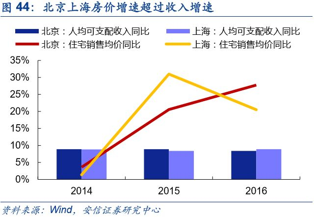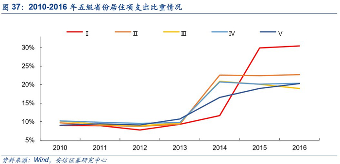 比较五级省份的商品住宅销售均价,我们发现Ⅰ级省份的均价在 2016 年高达 2 万元/ 平方米,同比增长 15.6%,Ⅱ级省份的均价也有 9000 元/平方米,同比增长 14.1%, 远高于Ⅲ、Ⅳ、Ⅴ级省份。以Ⅰ级省份中的北京和上海为例,购买一套 90 平方米的住宅需要 40 年的收入,并且房价的增速在近两年已经超过人均可支配收入的增长。经济发展较快的省份房价的快速增长,使居住性支出占比在居民的消费支出占比高居不下, 对消费造成了严重的挤出。