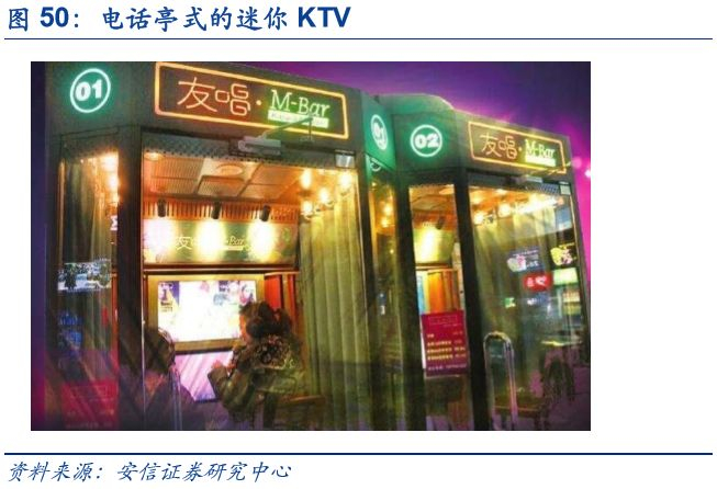 快餐化:短平快的快餐式商业模式的兴起是消费去形式化趋势的又一种表现,例如 2017 年开始,一线城市的热门商圈密集出现像电话亭一样的迷你 KTV,占地仅 2 平方米左右,按小时和歌曲数量来计费,可以供单人或双人使用。以友唱 M-bar 为代表, 目前在全国共装机 5000 多台,覆盖约 29 个省份,每天用户增长 3-4 万人次,发展 十分迅速。据艾媒咨询数据显示,2017 年中国线下迷你 KTV 市场规模预计将达到 31.8 亿元,较 2016 年增长 92.7%,实现市场大爆发。除此之外,一线城市还出现了迷你版健身房以及简易版的站式牛排等等,都是快餐化模式的一种表现。