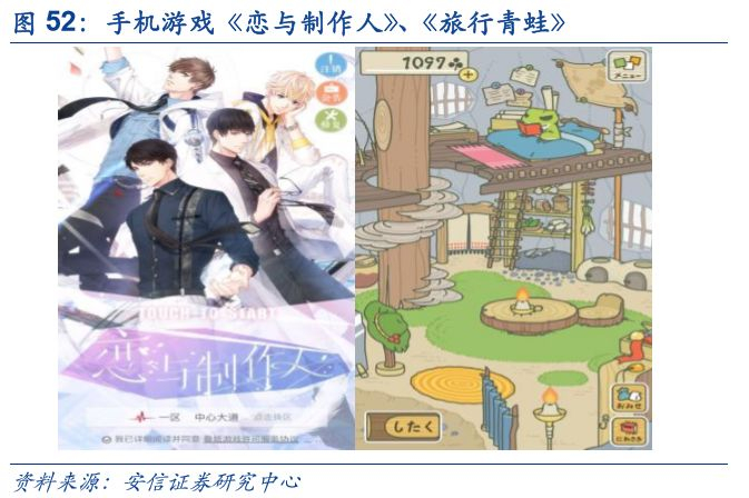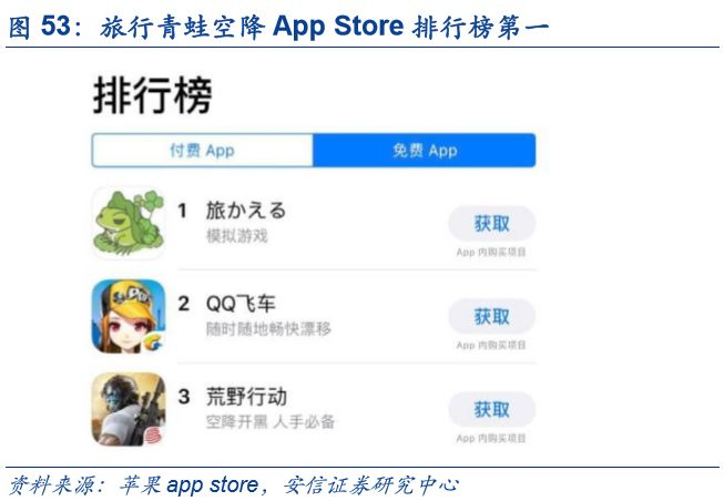 2018 年初,一款名为旅行青蛙的日本手机游戏在社交网站上一夜爆红,成功登顶国内 App Store 排行榜的冠军。这款放置手游操作极其简单,玩家只需要给青蛙准备好 行囊,然后等待青蛙出门旅行,寄回明信片。这款游戏火热的背后,蕴含着当下中国 年轻一代由于客观购买能力不足与主观对消费升级的渴望的矛盾,人们希望能与游戏中 的青蛙一样随心所欲的旅行,做自己想做的事情。这与日本在上世纪 90 年代经济危机时 情况十分相似,生活在大都市的日本人每天面临高负荷的工作和巨大的经济压力,普遍出现焦虑、抑郁、厌倦等负面心理,很多“治愈系”的动漫影视作品和商品正是在这个时候大量出现。