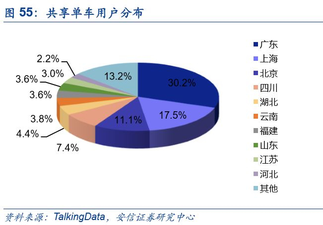 而在中国部分地区,共享经济正在蓬勃发展。以出行领域为例,人们已经习惯于最后一公里使用 OFO、摩拜单车分时租赁,数据显示,单车用户 TOP10 多为广东、上海、 北京等经济发展较快的省份人群。除此之外,共享经济在其他领域也有强劲的发展, 在交通出行领域的滴滴、Uber 等叫车软件彻底改变了出租车的业态;房屋住宿领域 的 Airbnb、途家等住宿共享服务满足了人们对于住宿空间个性化、性价比的多维度要求;还有充电宝共享,咸鱼等闲置交换等生活服务领域的平台进一步便利了生活, 提高了资源使用效率。2016 年,中国共享经济蓬勃发展,市场交易额约 34520 亿元, 比 2015 年增长 103%,融资规模约 1710 亿元,比 2015 年增长 130%,参与分享经济活动的人数超过 6 亿人,比 2015 年增加了 1 亿人左右(易观数据) 。共享经济作为消费“降级”的一种趋势,不仅满足了人们对于低成本和高品质的要求,更满足了消费背后社交化的需求。