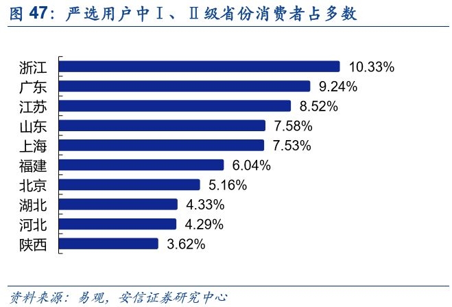 消费者在购买产品和体验时,做出了一种“降级”的行为,是在价格和产品的质量上回归更加理性的状态,追求高性价比,而非品牌。网易严选由于采用了 ODM 模式, 直接对接生产商,通过“无品牌”化去除了传统价值链中品牌商占有的较高的品牌溢价,以更低的价格为消费者提供同质的产品,正如口号宣扬的理念“好的生活,没那 么贵”。严选因此广受消费者青睐,上线一年间注册用户快速增长,截止 2016 年 9 月底达 3000 万,月流水达 6000 万。在严选的用户中,绝大多数是浙江、广东、江苏等Ⅰ、Ⅱ级省份的居民。同样追求性价比的米家优品、名创优品、拼多多等的快速 发展,都是消费者追求极致性价比的佐证。