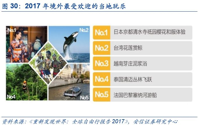 旅游出行:1)旅游不仅成为中国老百姓的必需品,也成为资本竞相追逐的蛋糕:2016 年,我国国内游达 44.4 亿人次,人均出游率达 3 次。2016 年全国旅游业实际完成投资 12997 亿元,同比增长 29%,比第三产业投资增速高 18 个百分点,比房地产投资增速高 22 个百分点(国家旅游局)。其中出境游市场持续增长达 1.28 亿人次。2)出境游客日益重视特色服务与享乐体验:住宿方面,出境游消费者首选酒店,但是游客对酒店需求更多元。同时在平台订单中,民宿紧随其后占据 13%,且 2017 年 1 月-5 月,更具特色的各色民宿的预订量同比 2016 年增长 7.21%,增长态势不容小觑。兴趣方面,骑行、 潜水、拍片、自驾、动物和美食排在出行兴趣增幅排行的前六位,消费者更加注重特色产品如日本京都和服体验、越南芽庄泥浆浴、台湾花莲赏鲸等。消费结构方面,境外购物消费大幅下滑,体现出旅游消费变得更加“理性”。事实上,这部分减少的支出转移到了享乐型消费上,数据显示 2017 年境外旅游餐饮消费增长 14%。