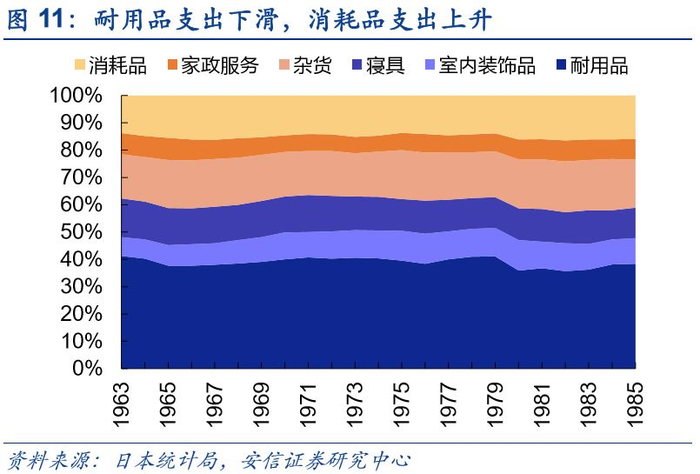 在家用品支出中,家庭耐用消费品占比居于首位,不过基本呈现下降态势,从 1963 年的41.3%下降至1985年38.4%再到2016年的31.7%。寝具与家政服务占比基本持平。家用消耗消费品支出不降反升,从1963 年的13.7%上升至 1985 年的15.9%再到 2016 年的 26.4%。说明具有明显可选消费品性质的支出是日本消费升级的基本方向。