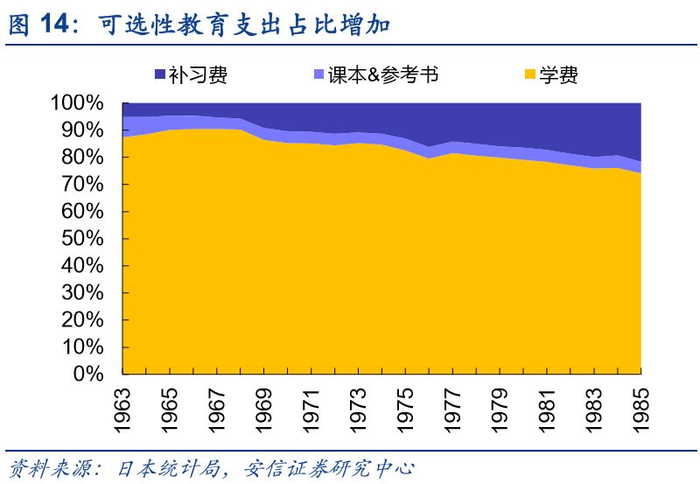 20 年间,学费支出占比下降,而作为可选性消费的补习费支出保持高速增长,在教育费用中的占比明显增加。