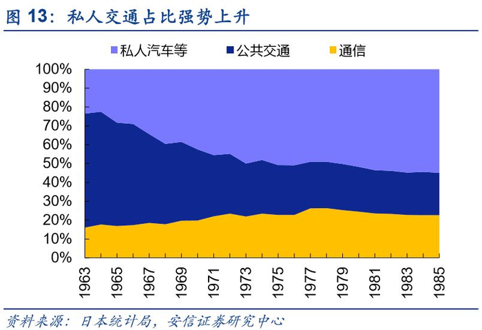 随着私人汽车的普及和移动电话的出现,私人交通支出占比强势上升,通信支出占比明显增加。70 年代爆发石油危机,日本大力发展依赖石油较少的汽车工业,且使得日本在 1980 年一跃成为全球最大的汽车制造国,伴随着国内市场需求猛增,私人交通也成为居民消费升级方向。