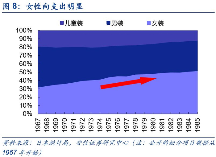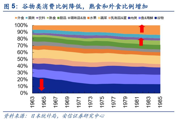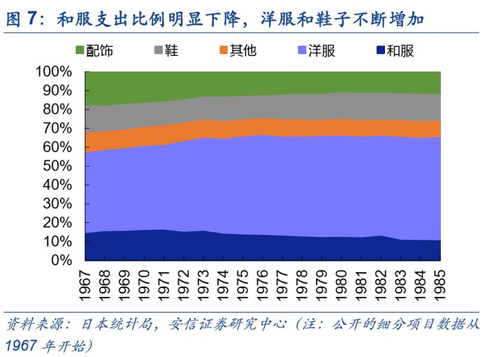 具体到可比期间来看,日本上世纪 70、80 年代的国家经济状况、收入分配政策结合特定时期的消费刺激成为推进消费升级的内源动力,人口结构的变化成为消费习惯变化的重要约束 条件。