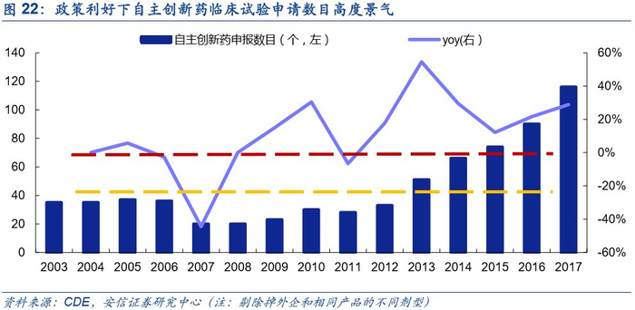 供给侧:医药改革推动医疗市场扩容、用药结构升级。医药行业强监管的属性导致医药领域消费升级将受到政策的深刻影响。受益于分级诊疗、医联体建设等医改政策,基层医院有望提高医疗服务水平、加强中高端设备购进与替代,国内医疗器械市场持续扩容;药品一致性评价改革与审评审批制度改革鼓励药品创新的制度红利正在释放,制药行业整体收入及利润增速明显。新政策有利于促进原研药创新与仿制药质量提高,自主创新 药申报数目由每年平均不到 40 个增加到近 120 项(2017 年),降低医药总费用支出, 从而改善居民用药结构。