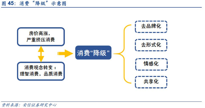 在高房价的挤出与消费者观念的升级共同驱动下,消费“降级”的现象由此产生。消 费降级人群的可支配收入在进行分配时,需要优先保证品质的是教育、医疗、母婴等, 可以紧缩的只能是日用品、生活娱乐以及更多精神层面的消费。消费“降级”并不简单的等同于消费商品价格或质量的降低,而是消费回归到产品本身,一系列新的消费趋势开始出现。追求高性价比,品牌意识削弱;摒弃传统的大店形式,进而对与自己的收入水平以及时间需求相对称的消费方式;不再通过大件消费获取满足感,重视消费背后的情感属性;以及放弃产品所有权,共享消费。