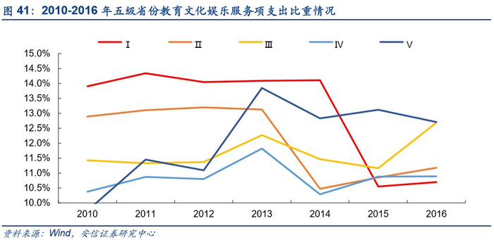 在教育文化娱乐服务支出方面,Ⅲ、Ⅳ和Ⅴ级省份的占比都在提升,尤其是Ⅲ级省份, 2016 年比上年提高了 1.5 个百分点。其中 2016 年Ⅲ和Ⅴ级省份的教育文化娱乐服务 支出占比(12.7%)是最高的;而Ⅰ级的占比则最低(10.7%),同时经历了急速的 下降,降幅达到 4 个百分点。教育文娱类消费的快速增长符合根据马斯洛需求层次理论,人们在满足了基本生理和安全需求之后,开始追求社交、尊重和自我实现需求, 加大了发展类消费对人们精神层面的塑造和投入,因此文娱项消费会快速增长。同一时期,Ⅰ和Ⅱ级省份却经历了教育文娱消费占比的下降过程,被居住项挤出最为显著。同时,Ⅲ、Ⅳ和Ⅴ级省份消费升级的潜力也最大。