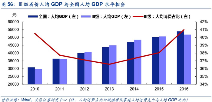 从全国情况来看,人均 GDP 增长较快,由 2010 年 30876 元逐步上升至 53980 元,从分层水平来看,中收入层即Ⅲ级省份人均 GDP 水平与全国情况几近一致。通过之前中日消费水 平对比的经验可以推断,与全国平均水平一致的中收入层目前正值消费升级阶段。人均收入的稳步提升促进居民消费,使得Ⅲ级省份的人均消费支出占比呈上升趋势,为消费升级提供了动力。