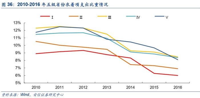 作为生存类消费之一,五级省份衣着项消费的占比总体上都呈现逐年下降的趋势,符 合消费升级路径。其中Ⅰ级省份衣着消费占比下降最快,占比也最低,Ⅱ级省份次之, 而Ⅲ、Ⅳ级省份的衣着消费占比相对较高,值得注意的是近年来 V 级省份衣着消费占比下降迅速。