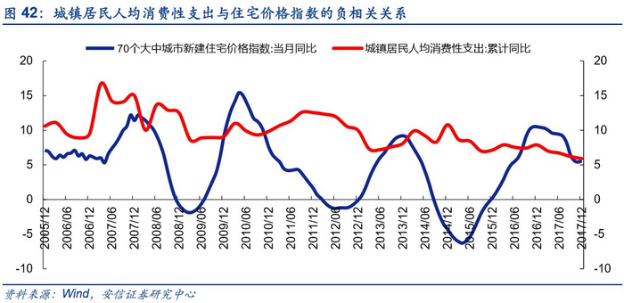 住房拥有消费品和投资品的双重属性,在我国房价不断攀升的过程中,住房支出对居 民消费性支出产生了挤压效应和财富效应。从城镇居民消费性支出与住宅价格指数的趋势看,2007 年以后两者保持着负相关的关系,表明我国住宅价格的上涨对消费支出的影响中,挤出效应占主导地位。