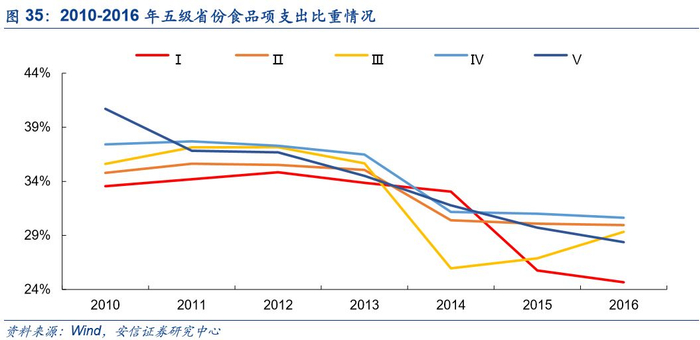 食品项消费是生存类消费的重要组成部分,除中等经济发展水平的Ⅲ级省份外,其他 省份的食品消费支出都在逐年下降,呈现出食品类消费回落的趋势。其中,经济发展 水平较高的Ⅰ级省份下降幅度最大,从 2010 年的 34%大幅下降至 2016 年的 25%;Ⅳ、Ⅴ级省份的消费项回落相对较缓。总体来看,食品项消费的逐年下降呈现出整体 消费强劲的升级趋势。