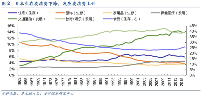 为得到长时段的消费趋势,我们研究了日本从1963 年以来的家庭年均消费,分别计算家庭 支出各个品类占总支出的比例及变动趋势,发现随着收入的不断提升,日本居民消费结构存在明显的消费升级状况,消费结构从生存型向发展型拓展。
