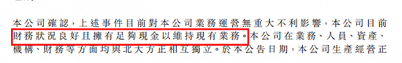 方正控股称“目前财务状况良好且拥有足够现金以维持现有业务”,而北大资源则未有更多表示。