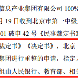 2月19日晚,6家上市公司再发公告称“北京一中院裁定受理北京银行股份有限公司提出的对方正集团进行重整的申请,指定方正集团清算组担任方正集团管理人,方正集团清算组由人民银行、教育部、相关金融监管机构和北京市有关职能部门等组成。”
