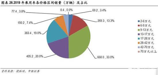 根据搜狐网数据,我们计算了 2019年各价位乘用车的销量数据及占比,其中 17-28万、28-42万、42-70 万价格区间的销量分别为 383.4万、150.2万及 77.4万辆,占比分别为 19.0%、7.4%、3.8%。