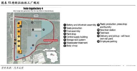 2019年 11月,特斯拉宣布在柏林附近的超级工厂建设 Model Y和 Model 3的 50万产能,包括电池、动 力总成以及整车的生产制造。柏林工厂的首款量产车型预计是 ModelY,一期产能 25万辆,预计将于 2021年完成建设。