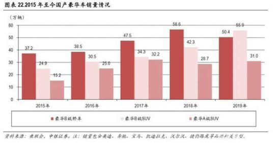 根据乘联会数据,主要的国产豪华 B级轿车、豪华B级SUV及豪华 A级SUV在2019年销量分别为 50.4 万、55.9万及 31.0万辆,合计销量高达 137万辆,且在持续增长中。