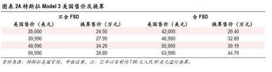 根据特斯拉官网消息,美国特斯拉 Model 3售价约 35,000-56,990美元(35,000美元版本暂无销售), 加装 7000美元 FSD后售价约 42,000-63,990美元。根据目前汇率换算,折合人民币分别为 24.50-39.89 万、29.40-44.79万元,可以为国产 Model 3后续定价作为参考。