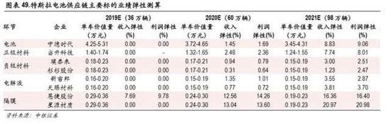 2020年中游企业海外供应爆发,动力电池、隔膜弹性最高:我们测算了 2019-2021年特斯拉供应链主 要标的业绩弹性,测算方法为先计算出标的所在细分领域单车价值量,然后根据该公司在特斯拉供 应链中的加权平均供货比例,计算相应的收入弹性和利润弹性。测算结果显示,尽管 2019年除恩捷 股份之外,其他公司业绩弹性均为 0,但是此后随着特斯拉销量快速增长和供货份额的提升,业绩 弹性快速提升,2020年是中游企业海外供应的爆发之年。从细分领域来看,动力电池是一级供应商, 单车价值量大,且供货份额稳步提升,宁德时代显著受益于特斯拉销量的增长,业绩弹性较大;隔 膜行业两家龙头企业较早切入海外供应链,其中恩捷股份已经进入松下、三星 SDI、LG 化学等三家 国际主流电池企业供应链,也是宁德时代的主要供应商,加权平均供货份额高,业绩弹性较大;正 极材料、电解液、负极材料次之。