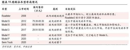 产品线逐步完善。目前特斯拉已经相继量产了 Model Roadster/S/X/3/Y,另外纯电动皮卡 Model P和纯电 动重卡 Semi Truck预计将于 2020年实现量产。产品线逐步完善,为后续销量增长奠定了良好基础。