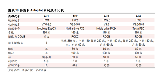 在自动驾驶方面,特斯拉起步较早,Autopilot 1.0系统于 2014年问世,搭载的是量产的第一代特斯拉 Model S车型。随着研发进步和车型更新,目前硬件版本已升级至 HW3.0,软件版本已升级至 V10.0。