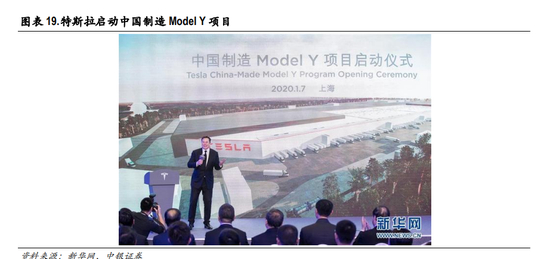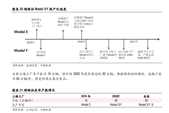 特斯拉 Model 3国产化进程持续超预期,2020年 1月即开始量产交付,美国 Model Y量产进程提前, 国内也有望提前。Model 3/Y所在细分市场空间高达数百万台,突出的产品竞争力将带来产销量爆发。 考虑 Model 3国产化率从 30%到 100%的提升,以及未来 Model Y的定点推进,相关产业链将持续受益。