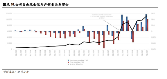 现金流创造历史最好水平。伴随着产销量的提升,特斯拉 2019Q4经营现金流高达 14.25亿美元,同 时资本支出环比小幅增长,自由现金流达到了 10.13亿美元,全年为 10.78亿美元。经营性现金流和 自由现金流均创造了历史最佳水平。
