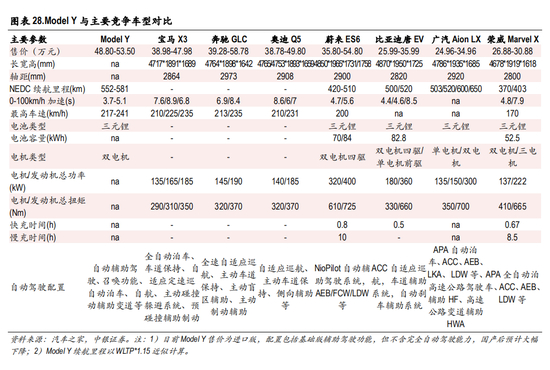 在新能源车型方面,奔驰宝马奥迪目前尚无竞争车型,较为类似的主要有蔚来 ES6、比亚迪唐、上 汽 Marvel X、广汽 Aion LX等。在续航里程、自动驾驶能力等方面,Model Y具有较大优势。