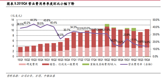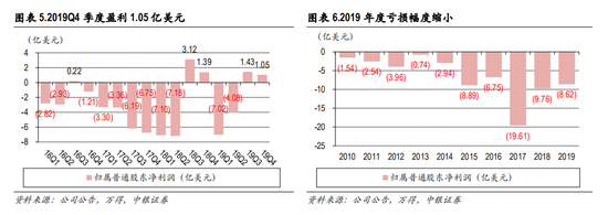 连续两个季度实现盈利。2019Q4利润为 1.05亿美元(同比下降 25%),实现了 2个季度的持续盈利; 经过 2.81亿美元的股权激励费用调整后,2019Q4的 Non-GAAP归母净利润为 3.86亿美元,高于此前市 场预期。受上半年拖累,2019全年净亏损 8.6亿美元,幅度有所收窄;后续有望随着季度盈利的持续 改善,逐步实现年度盈利。