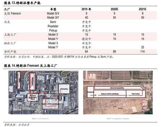 综合来看,特斯拉 2019年底总产能已达到 64万辆,2020年底至少将达到 89万辆,2021年底有望超 过 114 万辆(考虑皮卡及重卡产能,2020-2021 年产能或将更高)。通过美中德等地的全球布局,产 能瓶颈将逐步解决,保障其销量高增长。