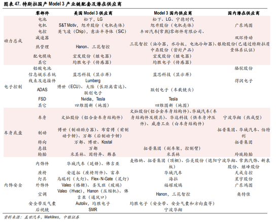 和 Model S/X类似,目前美国生产 Model 3供应商主要以外资为主,国内旭升股份、拓普集团、三花智 控、均胜电子、宏发股份等部分企业实现配套。