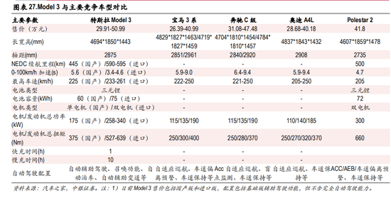Model 3 主要的燃油竞争车型包括宝马 3 系、奔驰 C 级、奥迪 A4 等。从对比参数可以发现,特斯拉 Model 3国产版售价 29.91万元起且后续有望降低,与主要竞品车型相当;续航里程 445-595km可以满 足日常需求;加速性能远优于燃油车,自动驾驶配置更加丰富。