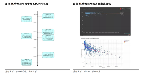 电池管理系统(Battery Management System, BMS)是电动汽车电池的核心控制部件,主要任务是保证 电池组工作在安全区间内,提供车辆控制所需的必需信息,在出现异常时及时响应处理,并根据环 境温度、电池状态及车辆需求等决定电池的充放电功率等。特斯拉早期立足自主研发,自 2007年起 就开始在电池管理系统等领域进行了专利布局,实现了 BMS核心技术的领先,由此带来特斯拉在续 航里程、电池性能衰减等产品性能上优于行业竞争对手。