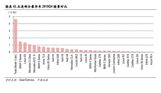 特斯拉自成立以来,一直是美国汽车电动化的先锋力量。自 Model 3量产以来,销量在细分市场遥遥 领先。根据 CleanTechnica数据,2019年第四季度美国 Model 3销量远高于宝马、奔驰、雷克萨斯、奥 迪等豪华车竞争对手。