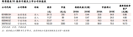 宁德时代:全球动力电池龙头,配套特斯拉业绩弹性较高。公司是具备全球竞争力的动力电池龙头 企业,2019 年国内市占率超 50%,主要客户包括上汽、吉利等自主品牌车企,公司已进入宝马、大 众等海外主流乘用车企业供应链体系,并与特斯拉签订协议,将向特斯拉供应锂离子动力电池,供 货有效期 2020年 7月 1日至 2022年 6月 30日。动力电池单车价值量高,且公司供货份额有望逐步提 升,在特斯拉供应链中业绩弹性较高。海外新能源汽车销量爆发在即,公司有望显著受益。我们预 计公司 2019-2021年每股收益分别为 2.03、2.41和 2.85元,维持 增持 评级。