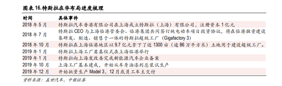 2018年 10月 15日,特斯拉(上海)有限公司以 9.73 亿元摘得上海临港装备产业区近 1300亩工业用 地,将在临港区独资建设集研发、制造、销售于一体的特斯拉超级工厂(Gigafactory 3),计划年产 能 50 万辆 ,成为中国新能源汽车领域放开外资股比后的首个外商独资项目。2019年 1月 7日,特斯拉 上海超级工厂开工建设,仅用 10 个月时间,2019 年 10 月即完成初期建设,并已开始从车身油漆到 总装试生产 Model 3车型。2019年 12月,上海工厂已开始小批量生产。