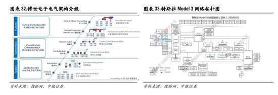 目前大部分整车企业电子电气架构还处于分布式阶段,每个功能拥有独立 ECU,如大众部分车型拥 有 70个 ECU。特斯拉早期 Model S也是采用类似的方案,但在最新的 Model 3车型上,电子电气架构 由 CCM(中央计算模块)、BCM LH(左车身控制模块)、BCM RH(右车身控制模块)三部分构成, 已经是最先进的集中式电子电气架构。据日经估计,特斯拉电子电气架构领先其它车企至少 6年。